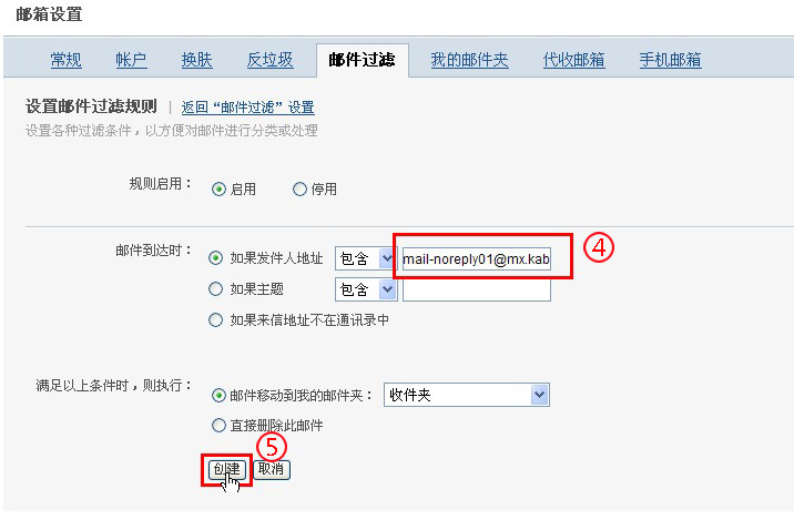 第三步:在“如果发件人地址包含”中填写上“mail-noreply01@mx.kaba365.com”,并点击“创建”按钮。