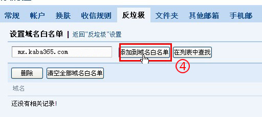 第三步:在“设置域名白名单”中填写上“ mx.kaba365.com”,并点击"添加到域白名单"按钮。