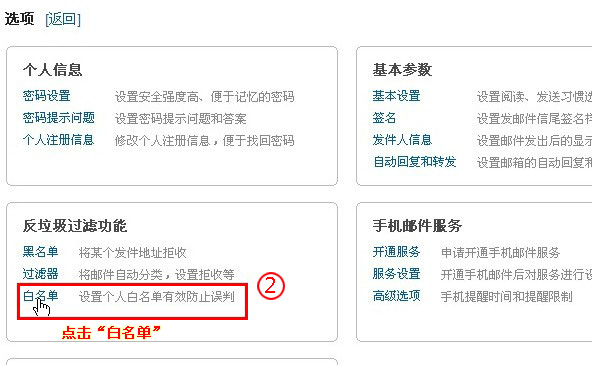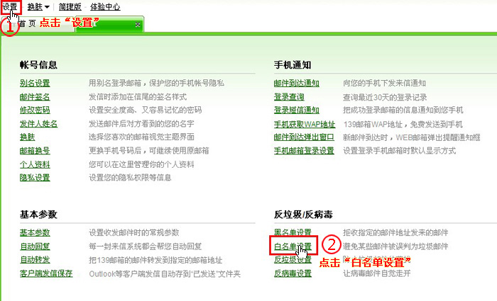 第一步:打开邮箱,点击网页上端的“设置”,在“反垃圾/反病毒”列表下点击“白名单设置”。