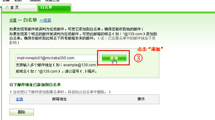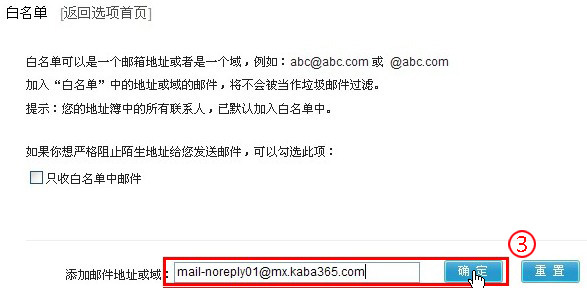 第二步:在白名单中填写上“mail-noreply01@mx.kaba365.com”,并点击“添加”按钮。
