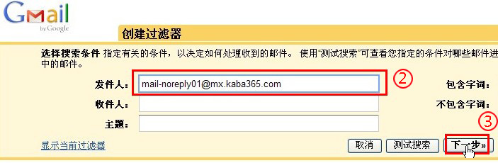 第二步:在“发件人”中填写“mail-noreply01@mx.kaba365.com”,并点击“下一步”按钮继续。
