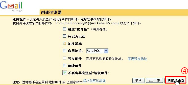 第三步:勾选“不要将其发送至'垃圾邮件'”,并点击“创建过滤器”。