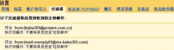 第三步:在“新过滤器”之“发件人包含”中填写上“mail-noreply01@mx.kaba365.com”,点击“确定”。