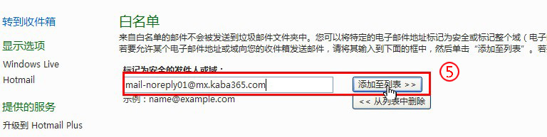 第四步:在“标记为安全的发件人或域”中填写“mail-noreply01@mx.kaba365.com”,并点击"添加至列表"按钮。
