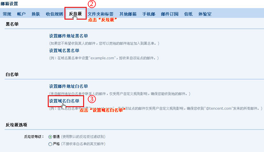 第二步:点击“反垃圾”标签下的“设置域名白名单”。