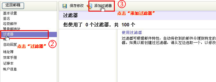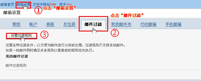第二步:点击"邮件过滤"标签页下的"设置过滤规则"按钮。