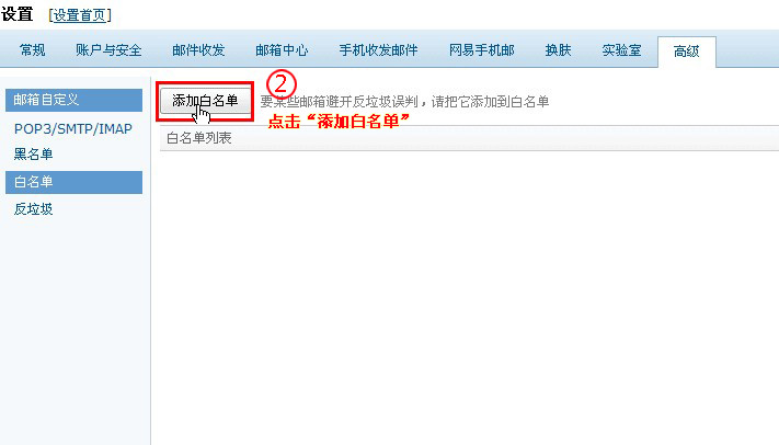第二步:在“反垃圾过滤功能”标签下点击“白名单”。
