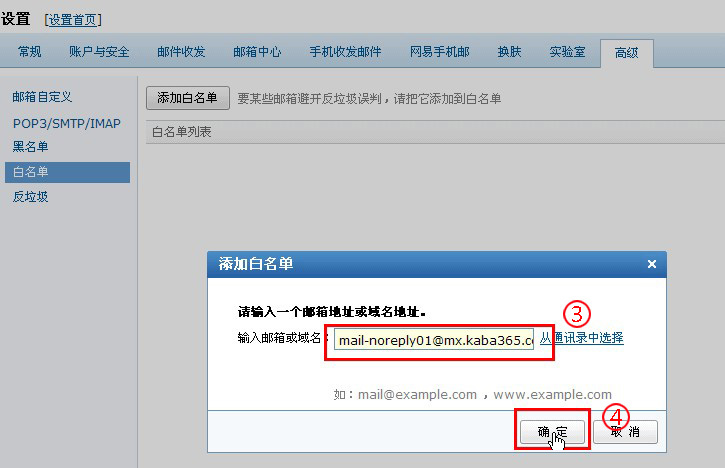 第三步:在“白名单设置”之"添加到白名单"中填写上“mail-noreply01@mx.kaba365.com”,并点击"确定"按钮。