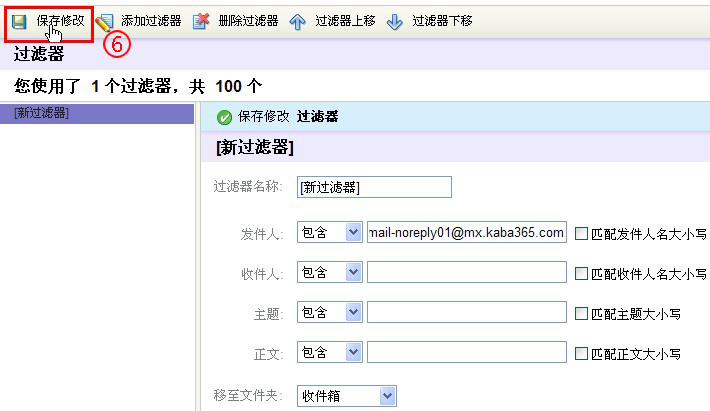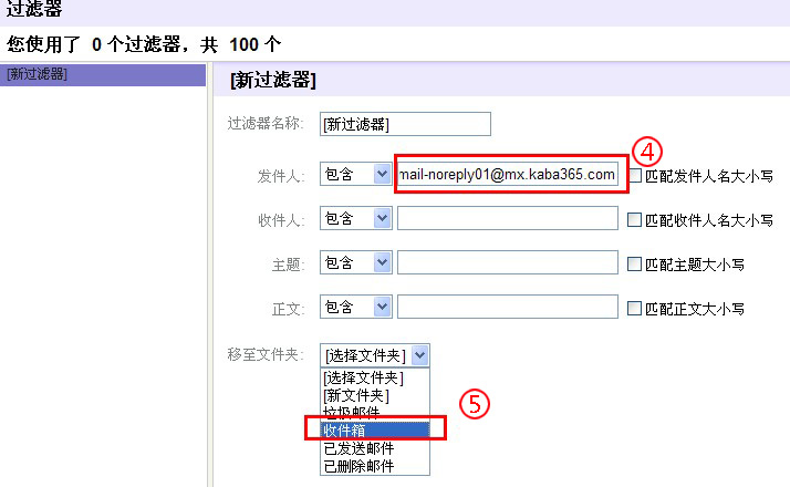 第三步:在“新过滤器”之“发件人包含”中填写上“mail-noreply01@mx.kaba365.com”,并在“移至文件夹”中选择“收件箱”。
