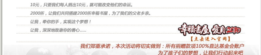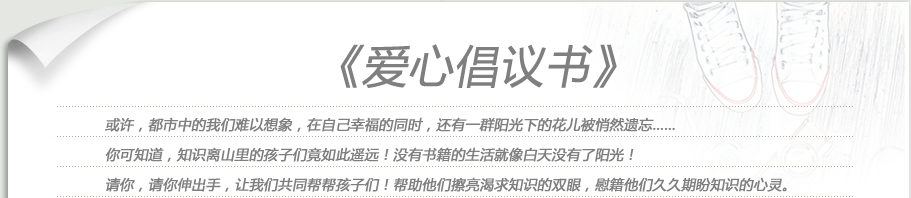 在众多贫困地区,物质援助只能改变一时,精神援助才能影响他们一世。现在,您只需参加本次活动,就可以捐助相应的爱心款,奉献一份爱心,为那些贫困地区的孩子带去知识财富、修筑通往未来幸福之路!