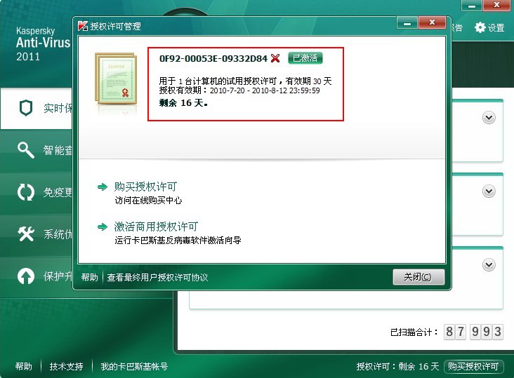 您可以在卡巴斯基主窗口的授权许可旁边看到授权的剩余天数。