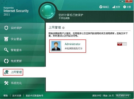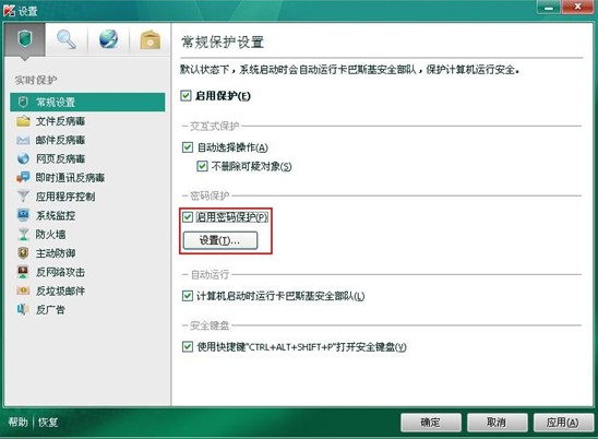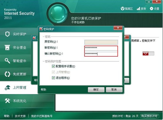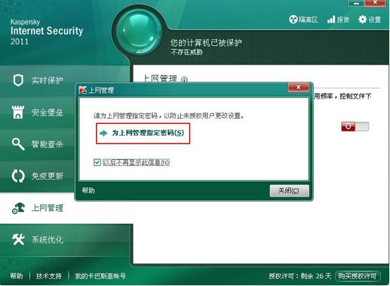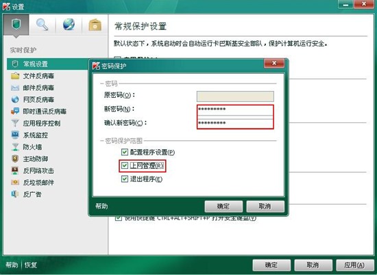 如何在卡巴斯基安全部队2011中设置上网管理的密码