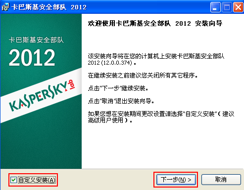 步骤1:如果您购买的是卡巴斯基安全部队2012光盘版,把安装光盘放入CD-ROM 后安装会自动开始运行。如果您是在线购买的产品,您会得到一个下载安装程序的链接,手动运行可执行程序进行安装。如果安装光盘没有自动运行,您也需要手动运行可执行程序来进行安装。为此需要打开卡巴斯基安全部队2012安装程序所在的文件夹并双击运行可执行程序。当您运行可执行程序后,将会启动卡巴斯基安全部队2012的安装向导。在安装向导的欢迎界面选择您所需要的安装类型: