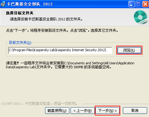 步骤4:选择安装卡巴斯基安全部队2012的文件夹。卡巴斯基安全部队2012默认的目标文件夹是C:\Program Files\Kaspersky Lab\Kaspersky Internet Security 2012\