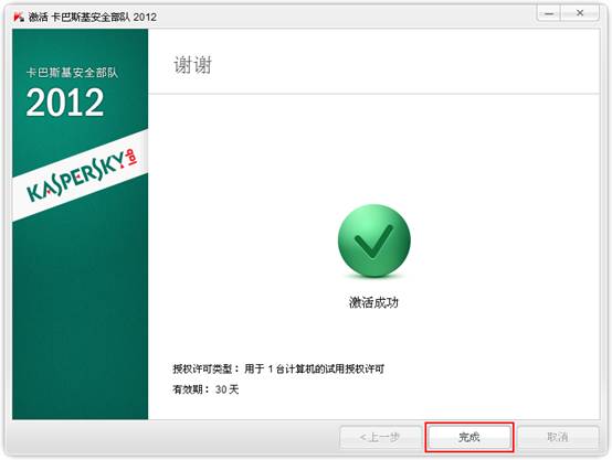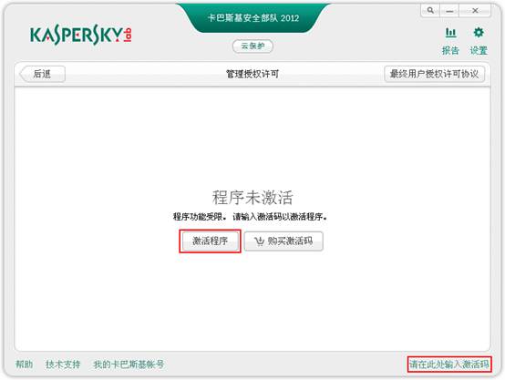 当安装向导完成后,需要激活卡巴斯基安全部队2012。提供以下方式进行激活:
