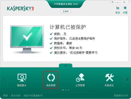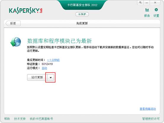 在卡巴斯基安全部队2012数据库损坏的情况下,推荐启动数据库更新,来下载有效的数据库以保持最新的保护。
