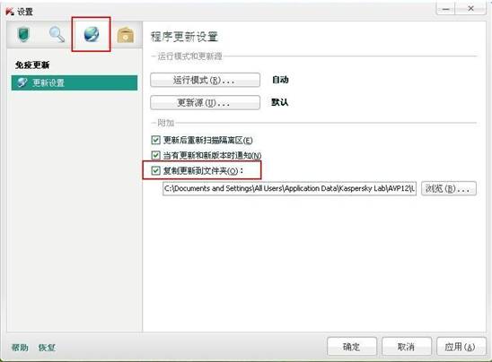 如果本地网络中安装有几个卡巴斯基安全部队2012,每一个程序需要设置为从本地文件夹更新。为了设置产品从本地文件夹进行更新,请执行以下操作: