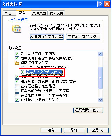 (vista系统路径为 C:\ProgramData\Kaspersky Lab\AVP12\Bases和C:\ProgramData\Kaspersky Lab\AVP12\Data\Updater 如果您找不到指定的文件夹,请您按照下面的步骤进行操作,然后再查找试试:双击计算机-组织-文件夹和搜索选项-查看-把垂直滚动条拉到中间-选择“显示隐藏的文件和文件夹”)
