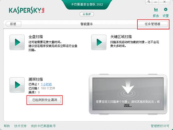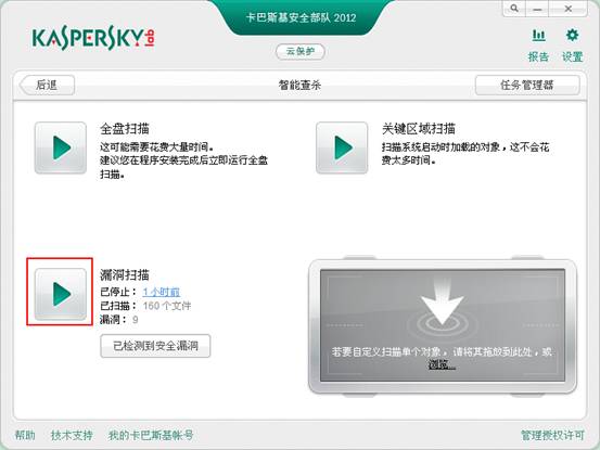 卡巴斯基2012如何启动漏洞扫描任务?(以安全部队为例,反病毒操作一样)