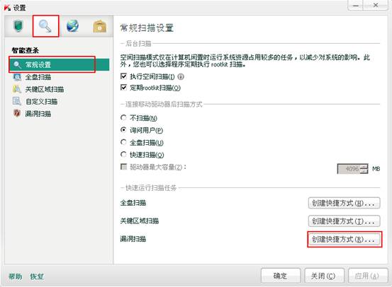 点击卡巴斯基安全部队2012右上角的设置按钮,选择智能查杀,在常规设置界面的右下角选择创建快捷方式。