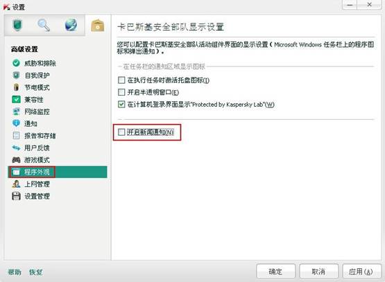 3. 在程序外观界面,将右边第四项开启新闻通知前的对勾去掉。点击右下角应用,然后确定即可关闭新闻通知。