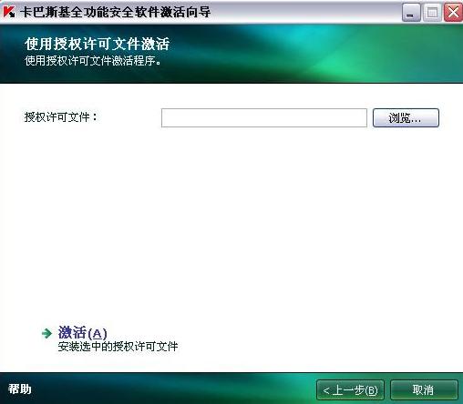 在下一个界面选择浏览,通过浏览选择授权许可文件所在位置,并且从中添加授权许可文件,选择激活,如下图: