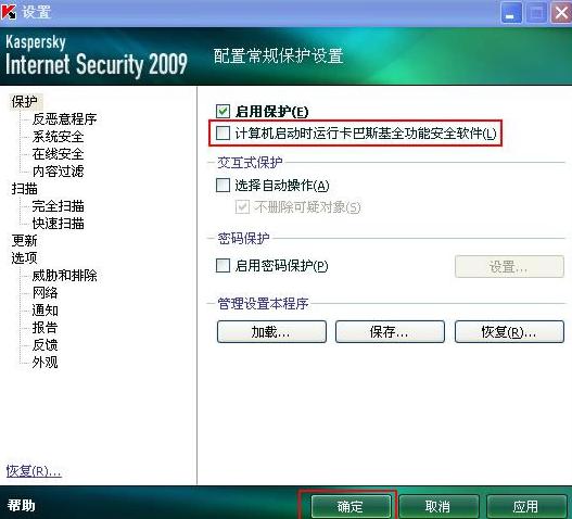 请双击桌面右下角卡巴斯基图标进入卡巴斯基主界面,点击右上角“设置”,点击左面树形目录中“保护”,将“计算机启动时运行卡巴斯基全功能安全软件”前面的“√”去掉,点击应用、确定即可。