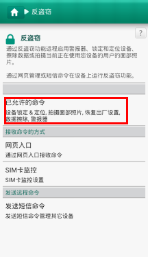 如果您允许您的设备恢复出厂设置,卡巴斯基安全软件安卓版将被移除。您将永远无法发送任何短信命令到该移动设备。