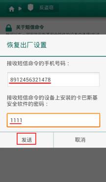 · 通过向接收设备发送短信命令。短信格式fullreset:<CODE>,其中<CODE>是接收设备的卡巴斯基安全软件安卓版中设置的密码。短信不区分大小写,冒号前后没有空格。